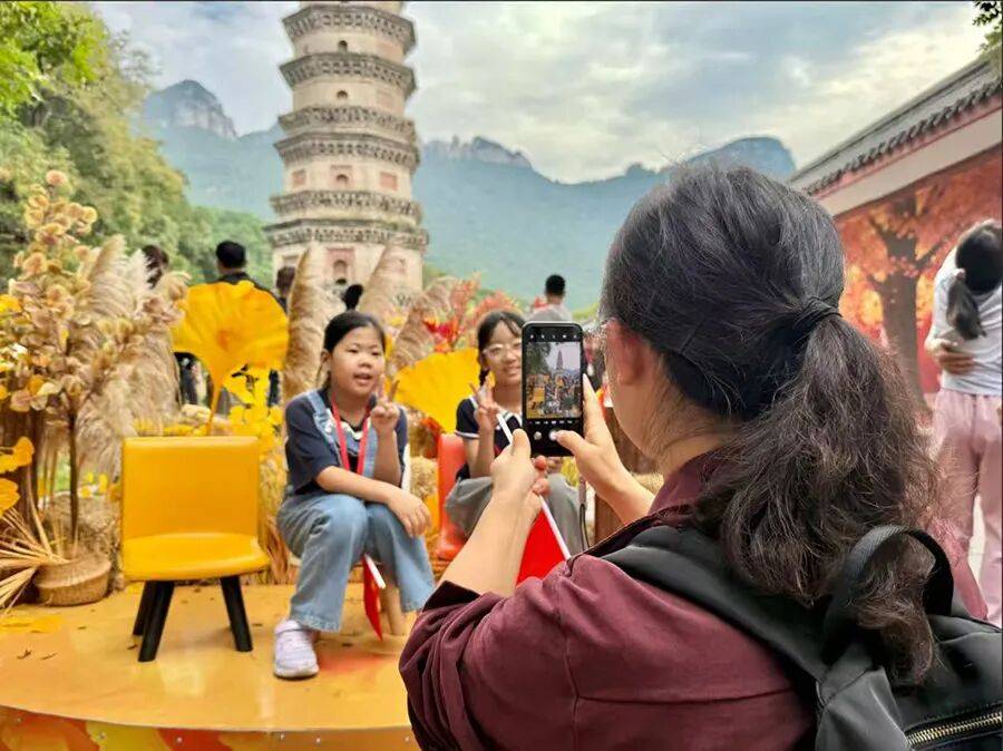 现场,“中国红”成为最亮眼的底色。不少人手持“我爱你中国”“欢度国庆”“为祖国喝彩”等定制手牌,在纪念馆特色打卡点前合影留念,用镜头定格赤子之心,记录下这个双节的独特记忆。