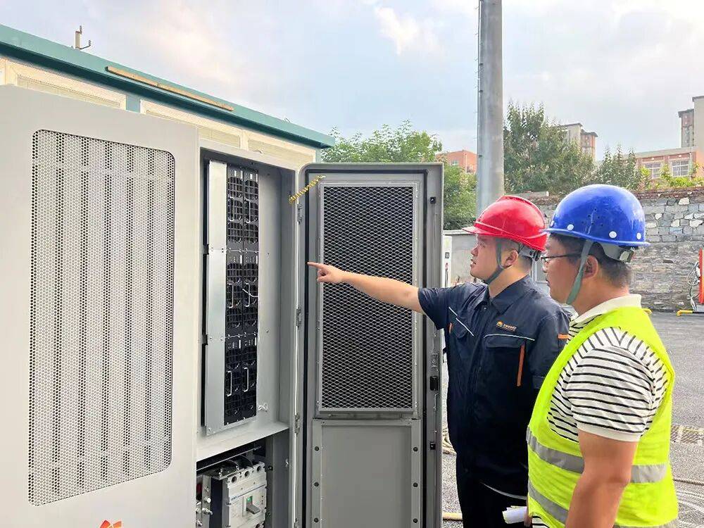 10月1日,国庆假期第一天,在济南能源鹊山储能电站,张哲雨正在对电池舱及pcs舱进行日常巡检,测量温度确保设备正常安全运行。