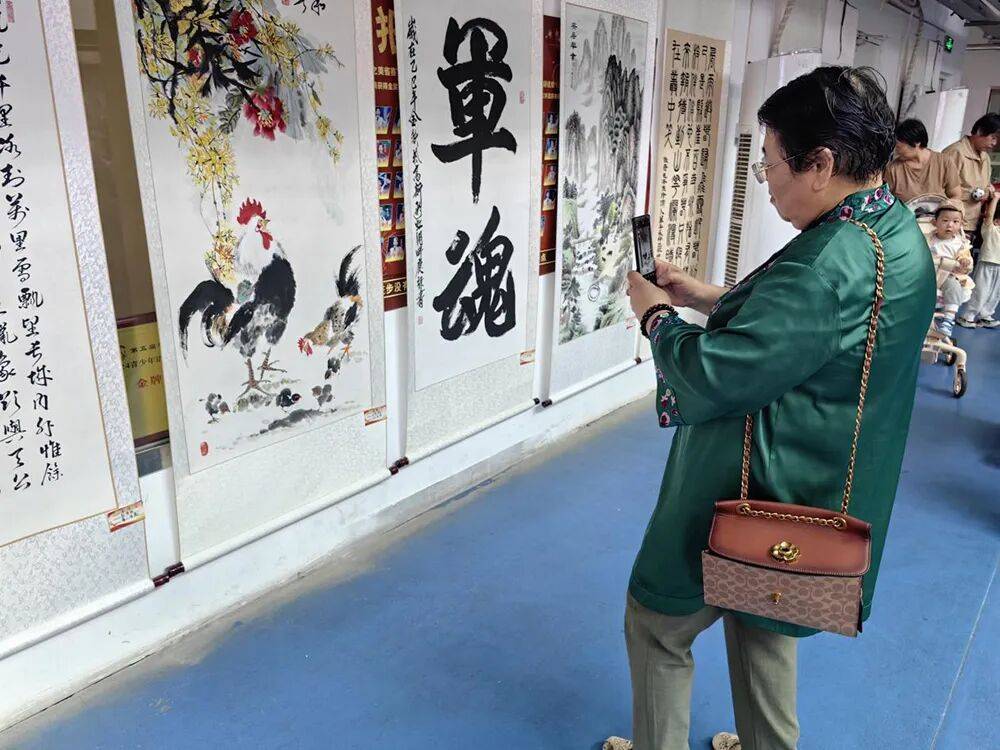 展览现场汇集了社区居民创作的多样书画作品,涵盖楷书、行书、草书、隶书等多种书体,以及山水、花鸟、人物等各类画作。