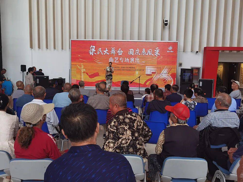 济南市文化馆一楼大厅,“泉民大舞台 国庆展风采”曲艺专场演出吸引了众多观众。来自济南市戏曲曲艺中心济南市曲艺团的演员们带来了坠琴、评书、单弦等节目。现场欢笑声、掌声不断。