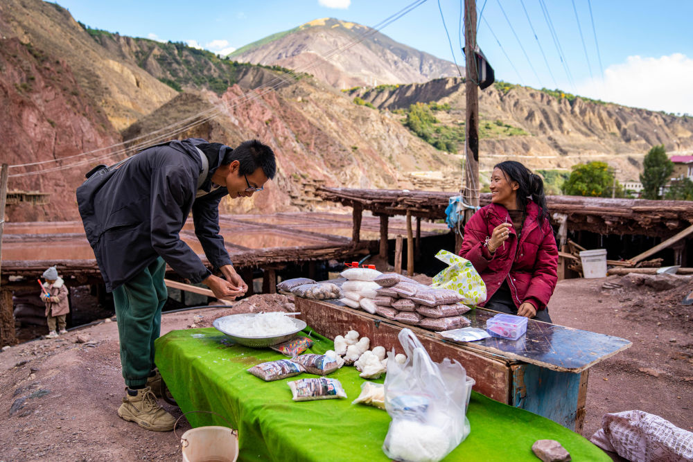 2023年10月20日,昌都市芒康县纳西民族乡加达村村民在盐田旁向游客推销自家产的盐。加达村位于澜沧江畔,从唐代开始制盐,距今已延续1300余年。当地村民保持着原始的手工晒盐方式,从澜沧江畔的盐井、盐池中取出卤水倒入盐田,经阳光蒸晒、风干,结晶成盐。依托千年古盐田,当地探索产业融合发展模式,大力发展旅游产业,越来越多的游客慕名“打卡”,带动村民增收致富。