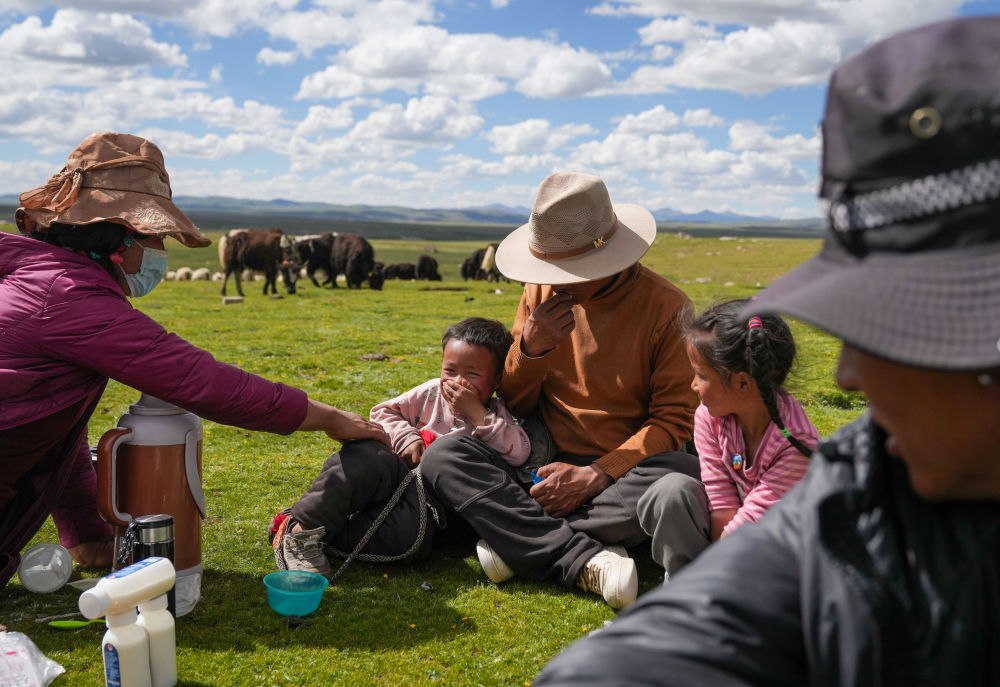 2022年7月19日,从那曲市双湖县多玛乡搬迁到森布日安置点新居的牧民在新家里聊天。为破解人与自然和谐共生难题,筑牢国家生态安全屏障,西藏自治区于2019年开始开展全国海拔最高县西藏双湖县高海拔生态搬迁。2022年7月,西藏实施双湖县第二批高海拔牧民生态搬迁,南部4个乡镇牧民告别苦寒高远的藏北,迁往雅鲁藏布江畔的森布日安置点,在新家园开启新生活。