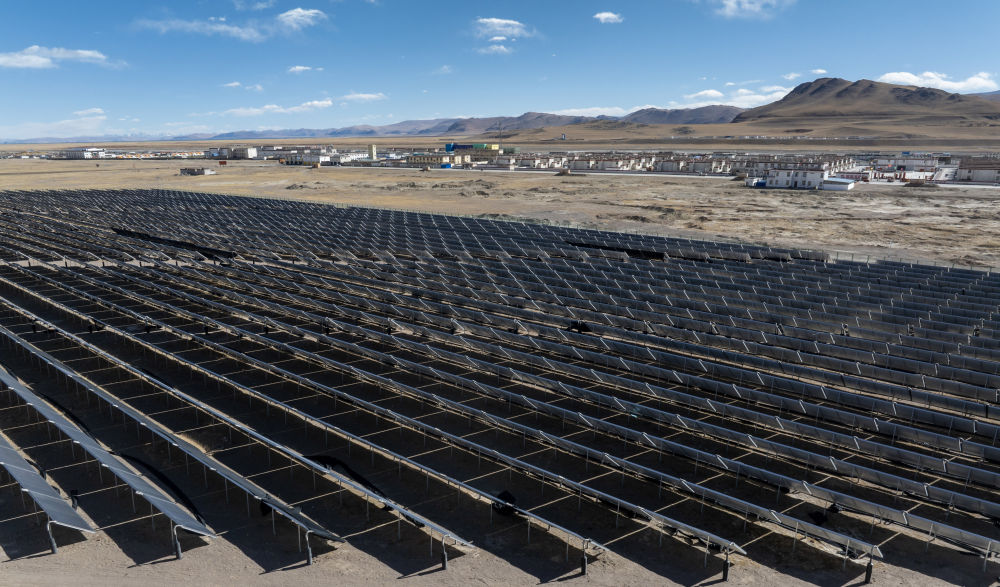 2024年11月20日在阿里地区措勤县拍摄的光伏阵列。西藏拥有丰富的清洁能源资源,水力资源可开发量1.8亿千瓦,光伏资源可开发量98亿千瓦。长期以来,西藏挖掘清洁能源潜能,持续推进清洁能源项目建设。从极度缺电到加快建设国家清洁能源基地,从产能方式单一到水能、风能、太阳能、地热能发电齐上阵,西藏清洁能源电力装机占比达到96%,比重全国第一;清洁能源发电量占比超99%,基本实现全清洁电力供应,成为全国清洁能源发电量占比最高的省级电网。