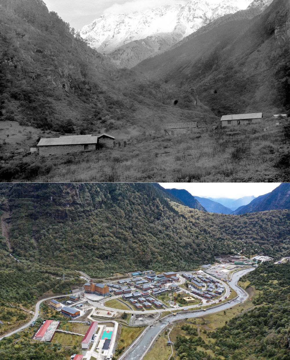 上图为1997年9月拍摄的玉麦乡;下图为2024年10月14日拍摄的玉麦乡。山南市隆子县玉麦乡地处喜马拉雅山脉南麓,受恶劣自然条件影响,这里一度只有桑杰曲巴和女儿卓嘎、央宗三人居住,牢牢守在祖国边境线上,曾被称为“三人乡”。从2018年开始,玉麦乡开展边境小康村及配套设施建设,轻钢龙骨架构民居及排水、通讯、学校、中心公园等公共服务设施拔地而起。2019年,国家投资超5亿元、总里程50公里的曲玉柏油公路改建工程全面完工,解除了玉麦每年大雪封山的困扰;同时,国家电网将10千伏的输电线路接入玉麦,玉麦人用上了安全稳定的常明电。如今,当地已发展到67户200多人,变成下辖两个行政村的“小康乡”。2023年,玉麦全乡人均年收入超4万元,人均居住面积达40平方米。
