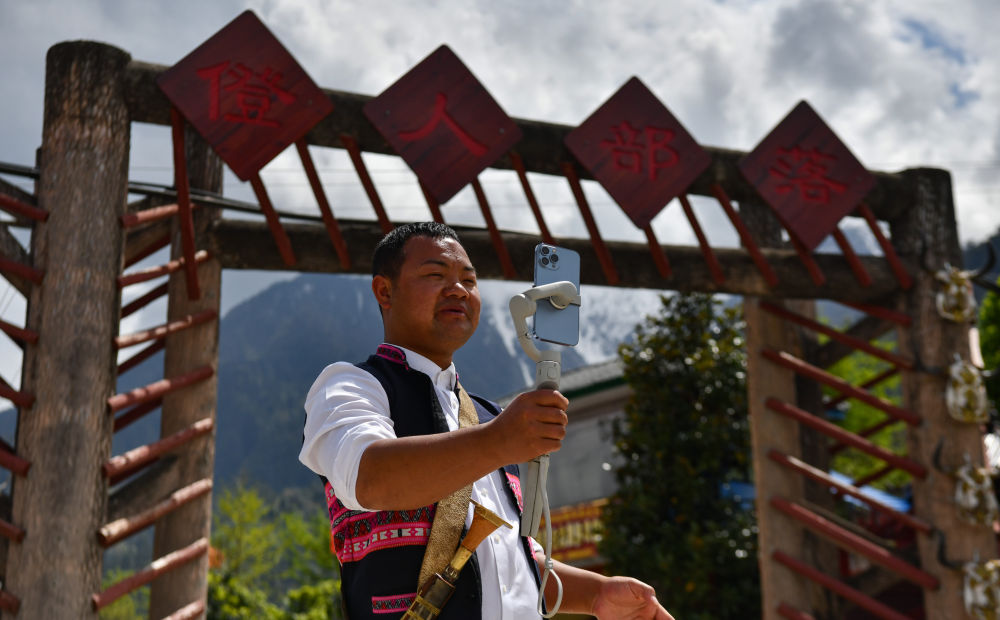 2022年4月19日,生活在僜人聚居村——林芝市察隅县沙琼村的僜人迪龙通过手机直播。僜人俗称“僜巴”,是生活在我国西藏边境的族群,人口较少。2017年起,迪龙通过制作短视频、直播带货等途径,介绍僜人文化和察隅县风情,推广当地名优特产,让野生灵芝、羊肚菌等长在深山的宝贝也走向大山外更广阔的市场。